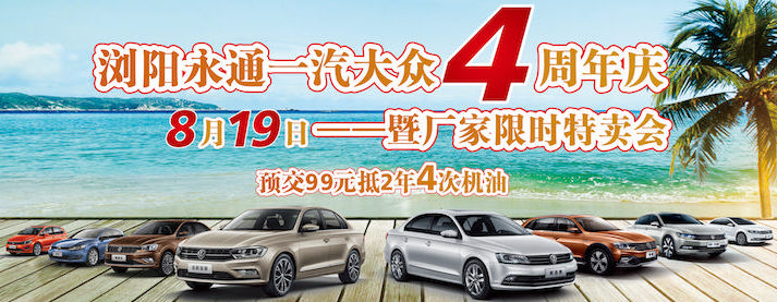 这个8月,浏阳永通一汽-大众4S店,迎来了4周年庆典,感恩回馈,全城钜惠来袭,就现在,一切正好,最佳购车时节,8月19日下午14:30,有车易联合浏阳永通一汽-大众限时特卖会,众夏行动,钜惠来袭!您还在等什么,趁现在赶紧报名参与抢购吧!