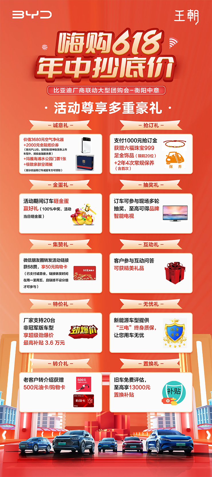 168元诚意金=价值3680元空气净化器+2000元金融抵价券(除元PLUS、冠军版/战神版及新上市车型外,抵扣金融服务费)+玛雅海滩水公园门票1张+极致亲肤空调被+循环抽奖+集赞领50元购物卡(部分权益需订车或提车可领取)
