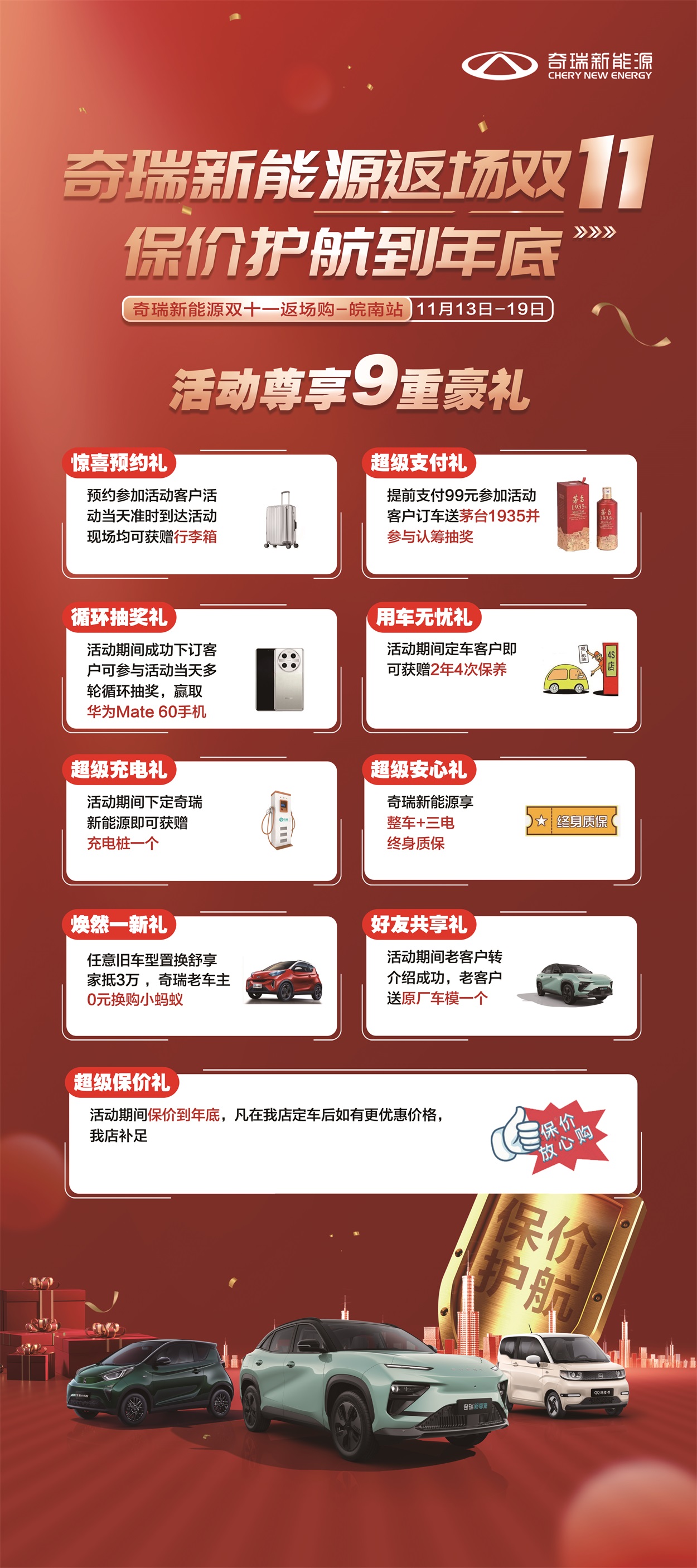 【芜湖市】奇瑞返场双11 保价护航到年底 奇瑞新能源双十一返场购--皖南站