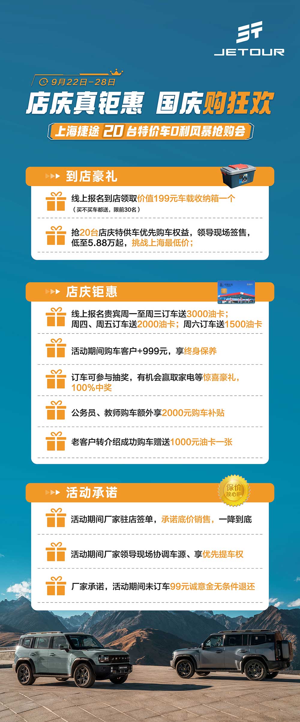 预存99=线上报名到店领取价值199元车载收纳箱一个+抢20台店庆特供车优先购车权益