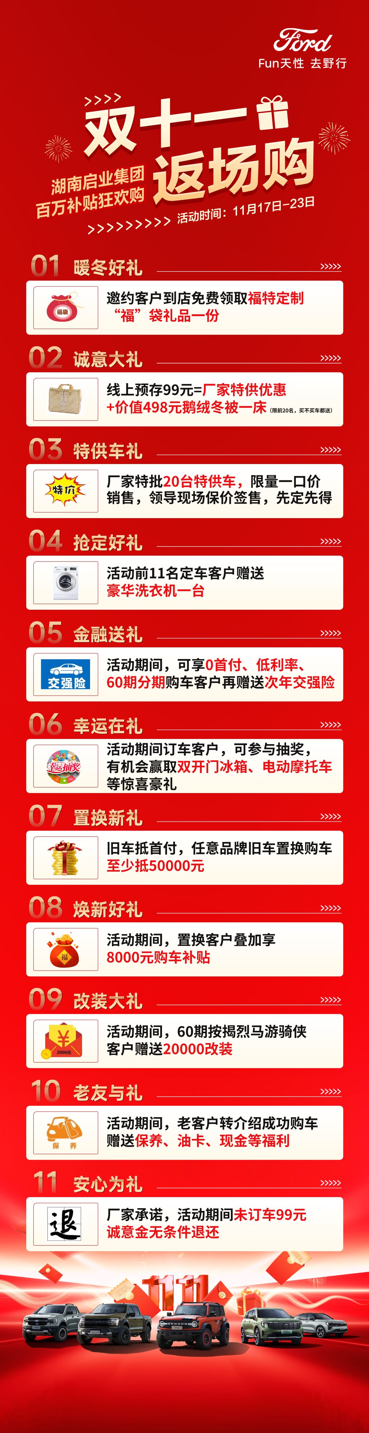 预存99元=到店领取福特定制“福”袋+厂家特供优惠+价值498元鹅绒冬被一床+前11名定车赠送豪华洗衣机一台