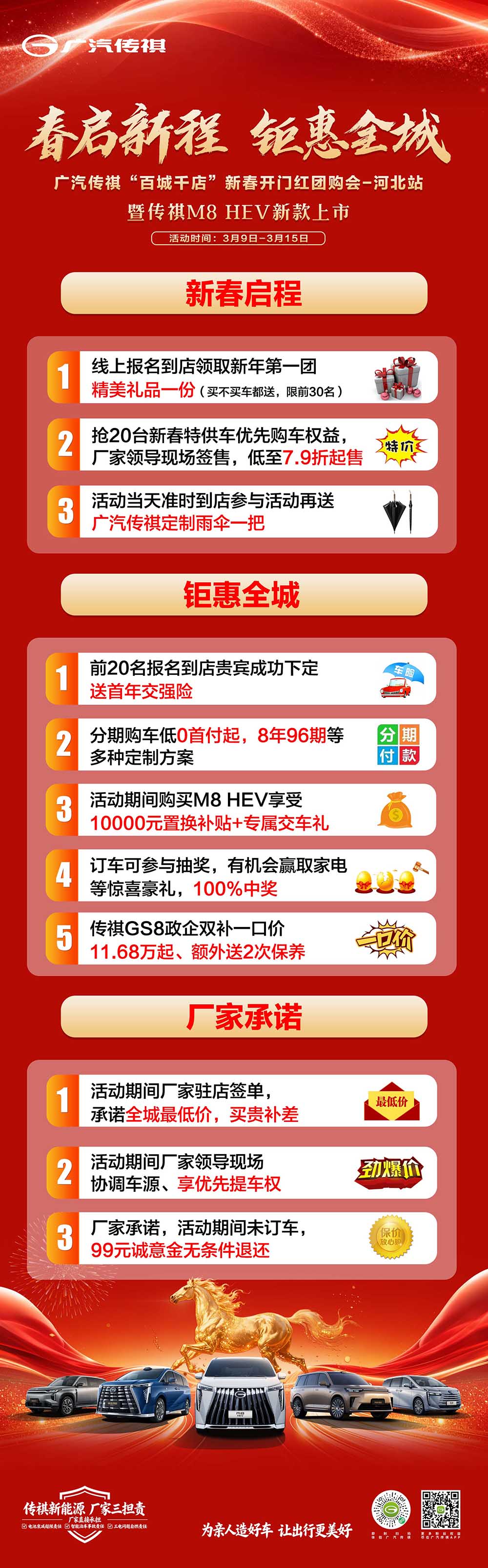99元诚意金=线上报名到店领取新年第一团精美礼品一份+抢20台新春特供车有限购车权益,厂家领导现场签售。