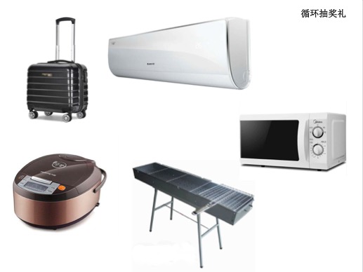 活动现场设置了5轮循环抽奖,前面中奖后还可继续循环抽奖。奖品有格力空调、微波炉、烧烤架、拉杆箱等,有机会中5个奖品