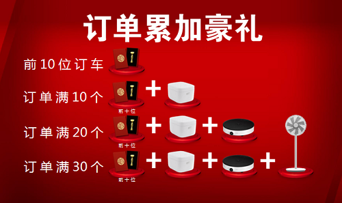 现场订车贵宾,越早订车可享受:千足金金如意+小米电饭煲+小米电磁炉+小米落地扇等大礼
